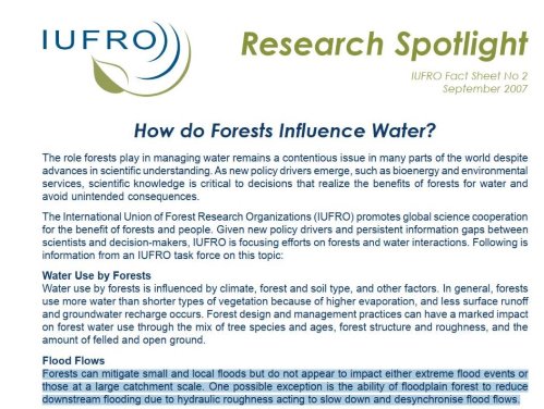 Tờ thông tin (Fact Sheet) của Liên minh quốc tế các tổ chức nghiên cứu rừng (IUFRO) mà tôi đính kèm với bài này cho thấy họ kết luận rõ ràng rằng “Rừng có thể giảm thiểu lũ lụt nhỏ và cục bộ nhưng dường như không tác động đến các trận lũ cực đoan hoặc lũ lụt trên quy mô lưu vực lớn. Một ngoại lệ có thể xảy ra là khả năng của rừng tại khu vực bị ngập lũ trong việc giảm lũ hạ lưu do độ nhám thủy lực làm chậm và làm mất đồng bộ dòng chảy lũ”.